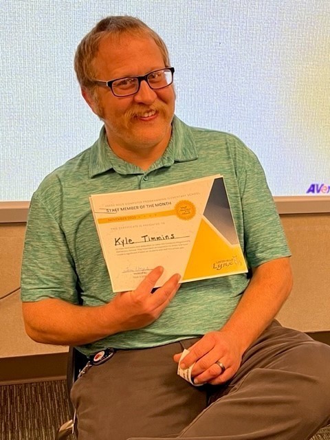 "Kyle builds strong relationships with students. He does particularly well working with students who are having a hard time with academics or behavior. Kyle keeps a calm and friendly demeanor no matter the situation, and his students calm down as a result. Every morning Kyle greets each student with a sincere smile, high five/fist bump, and welcoming conversation. Kyle was the iReady representative for fourth grade and is always willing to collaborate and share ideas with colleagues. He treats families with respect and communicates effectively so that parents feel involved. Thank you, Kyle, for all you do!"